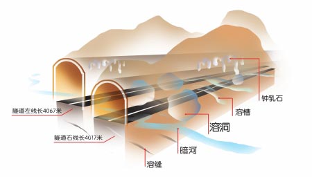 据施工方介绍,隧道三分之一段穿越可溶岩~碳酸盐岩类地质区,最大一处溶洞长宽高分别约200米、60米、30米,几乎相当于2个标准足球场大小。而直径在5米以下的溶槽、溶穴、溶缝就在3000个以上。46个大溶洞、6条暗河外加漏斗、涌突水、低瓦斯等复杂地貌使得叙岭关特长隧道的工程难度之大,在省内同类隧道中十分罕见,也使之成为了纳黔高速公路的头号高难度隧道。