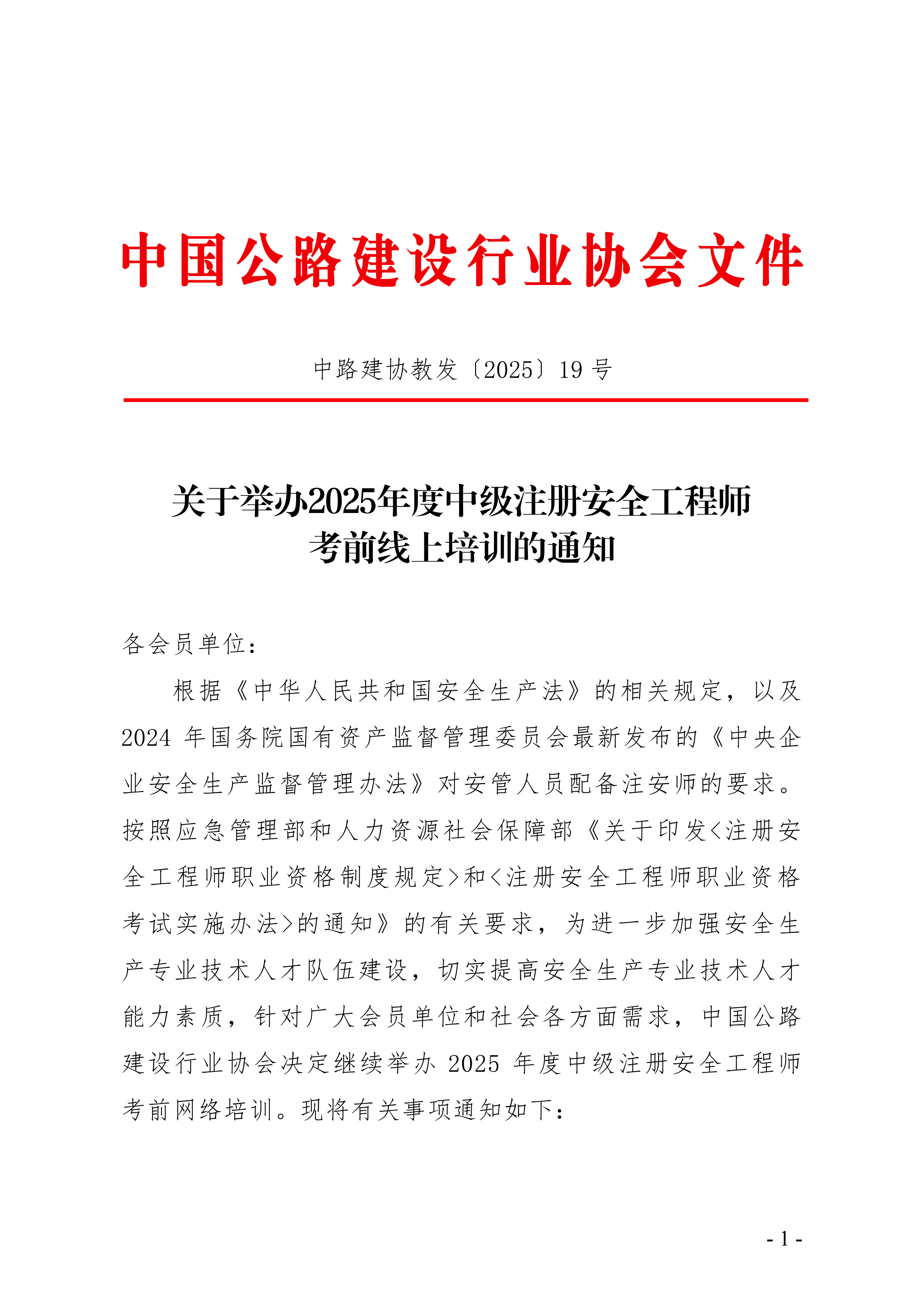 关于举办2025年度中级注册安全工程师考前线上培训的通知