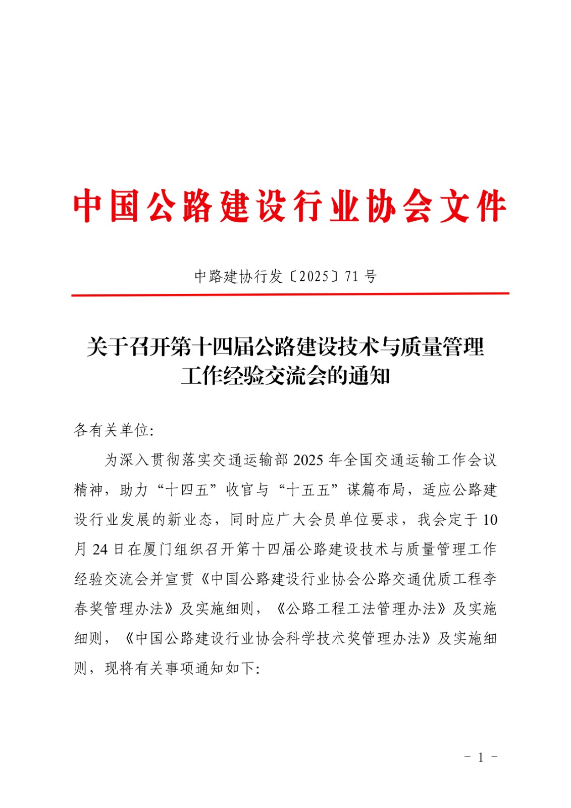 中路建协行发〔2025〕71号 关于召开第十四届公路建设技术与质量管理工作经验交流会的通知(5).pdf